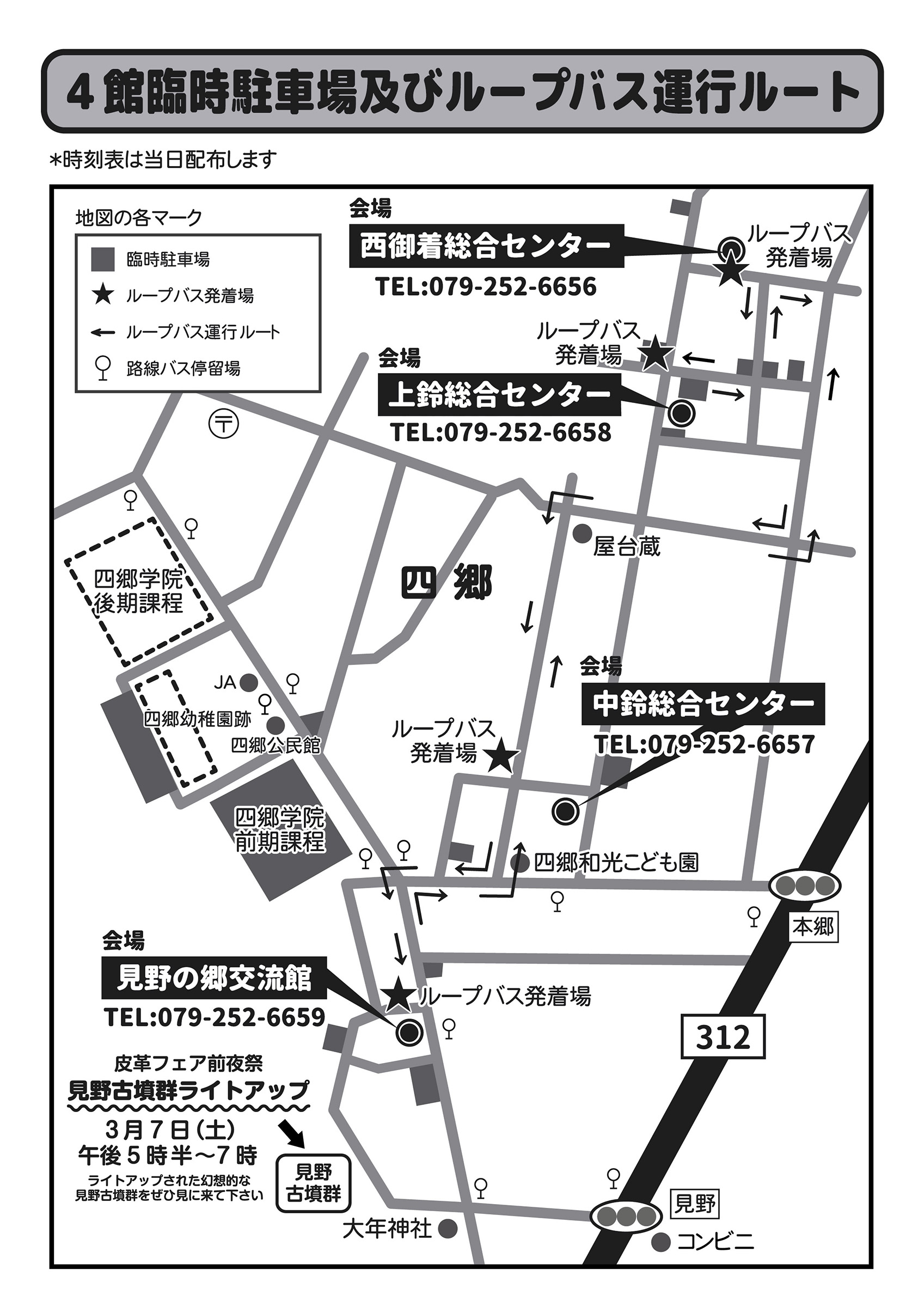 各会場を巡るループバスも運行します。さらに、4会場すべてを回った人には、革のしおりのプレゼント(先着500名様)もありますので、ぜひ、この機会に四郷町にお越しください。